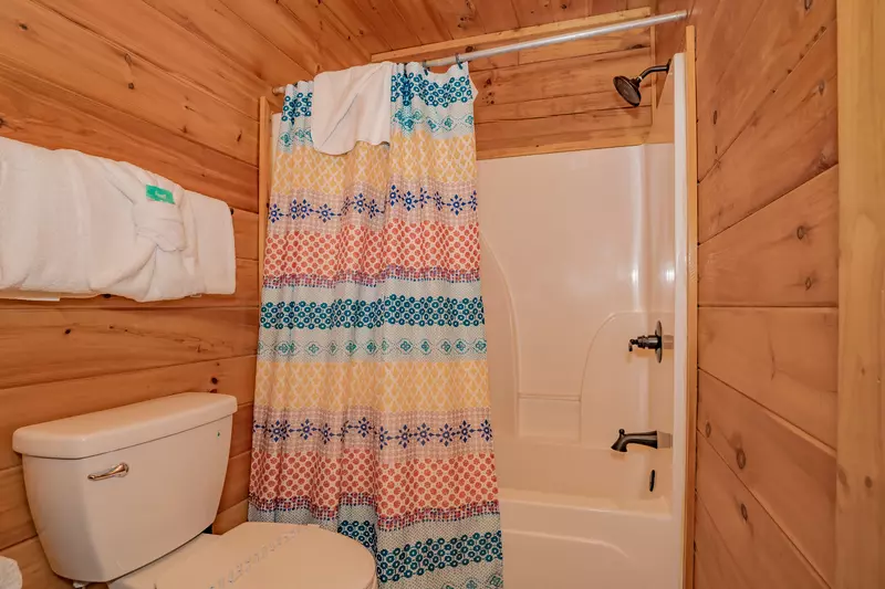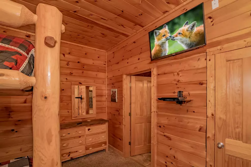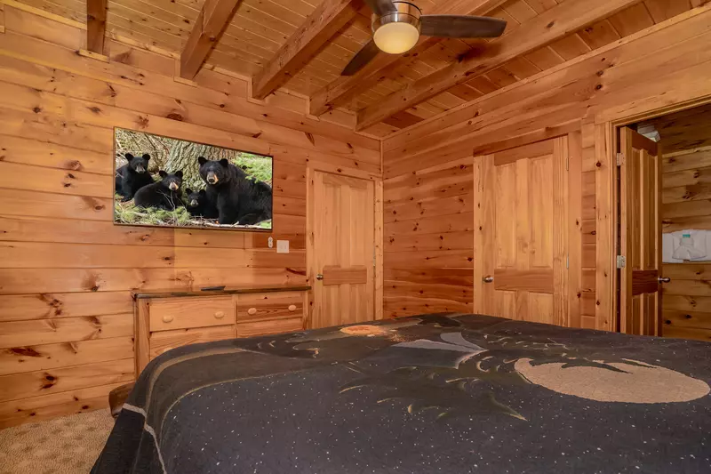 The upper level of this cabin features 2 master bedrooms each offering a King size bed, TV, private gas fireplace, and an attached (tub/shower) bathroom.