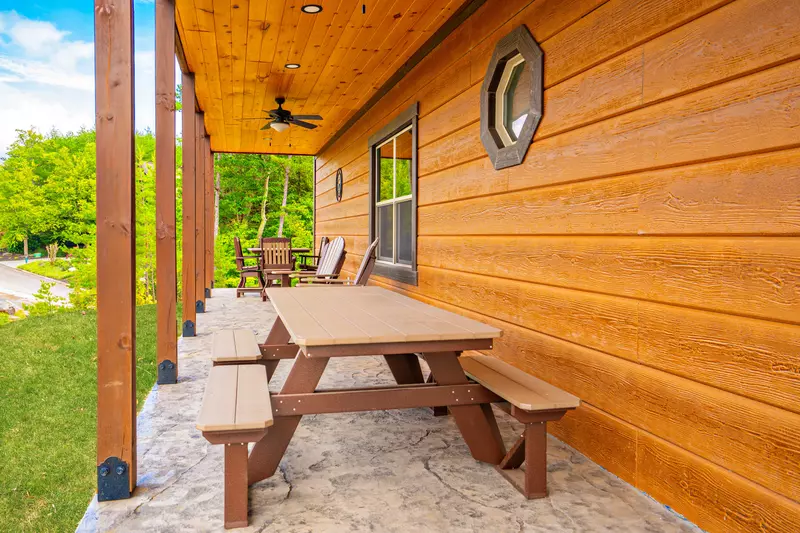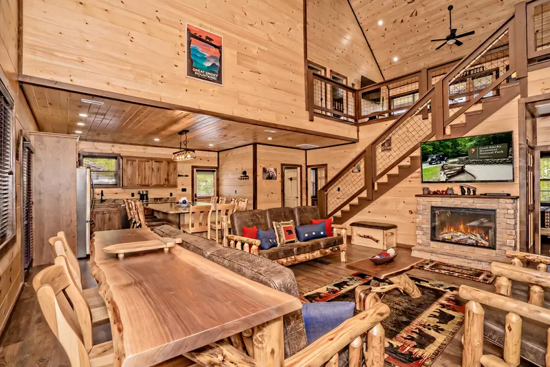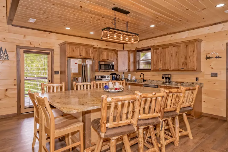 Entry level features the dine-in kitchen, living area, 2 bedrooms, 2 bathrooms, hot tub, and an indoor pool! The spacious living area features rustic-style seating just waiting for you to get comfortable, fire up the electric fireplace and catch up with friends and family or watch your favorite tv show on the big screen HDTV! The beautiful kitchen is sure to be a delight for the chef in the family! The kitchen area offers seating for 6 at the bar, as well as beautiful granite countertops and stainless steel appliances.