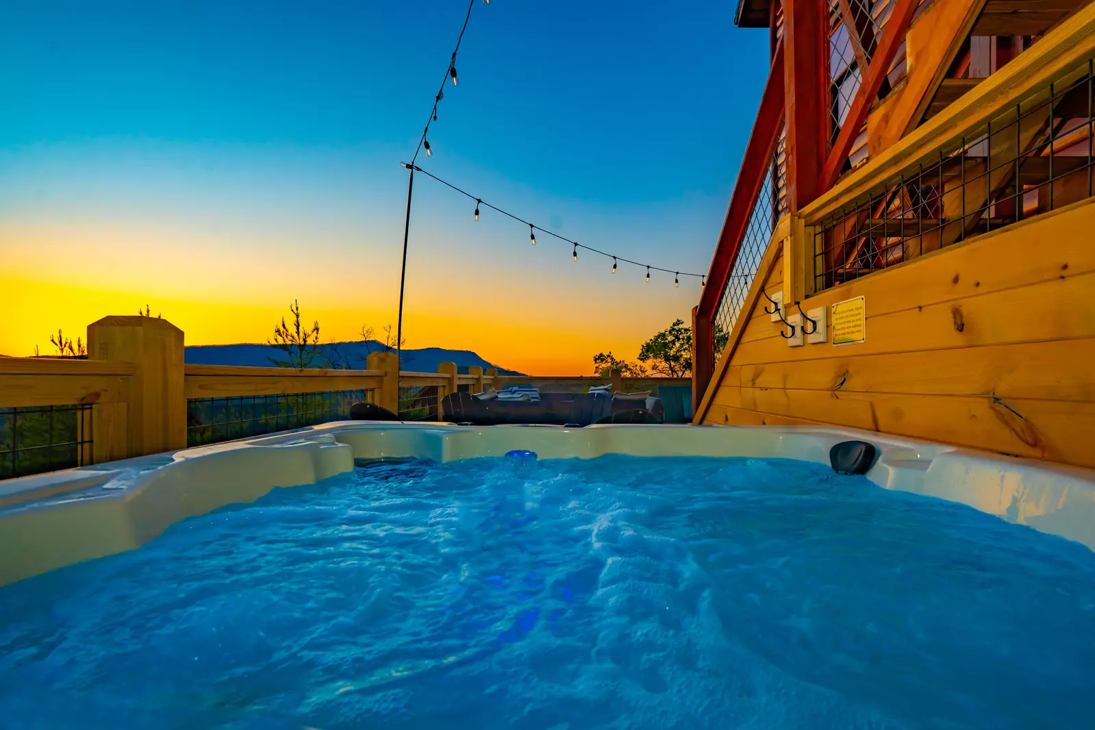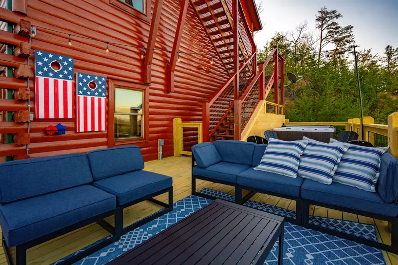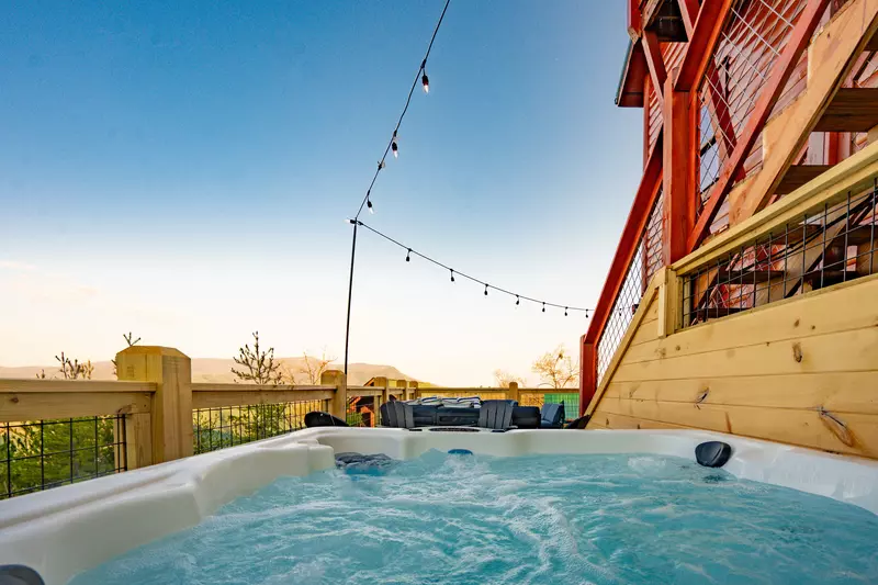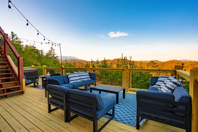 Step outside and towards the parking area you will find a 2 charcoal grills to enjoy a cook-out. To the left, you will be surprised by the large spacious deck area with comfortable seating, a gas fire pit, string lights and a large hot tub overlooking the amazing mountain views.