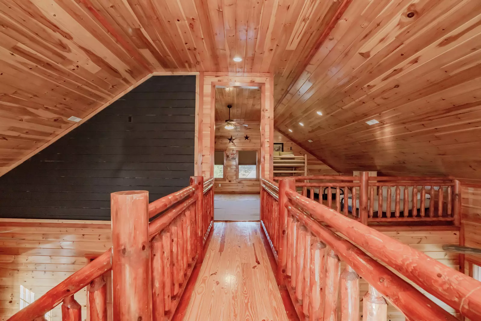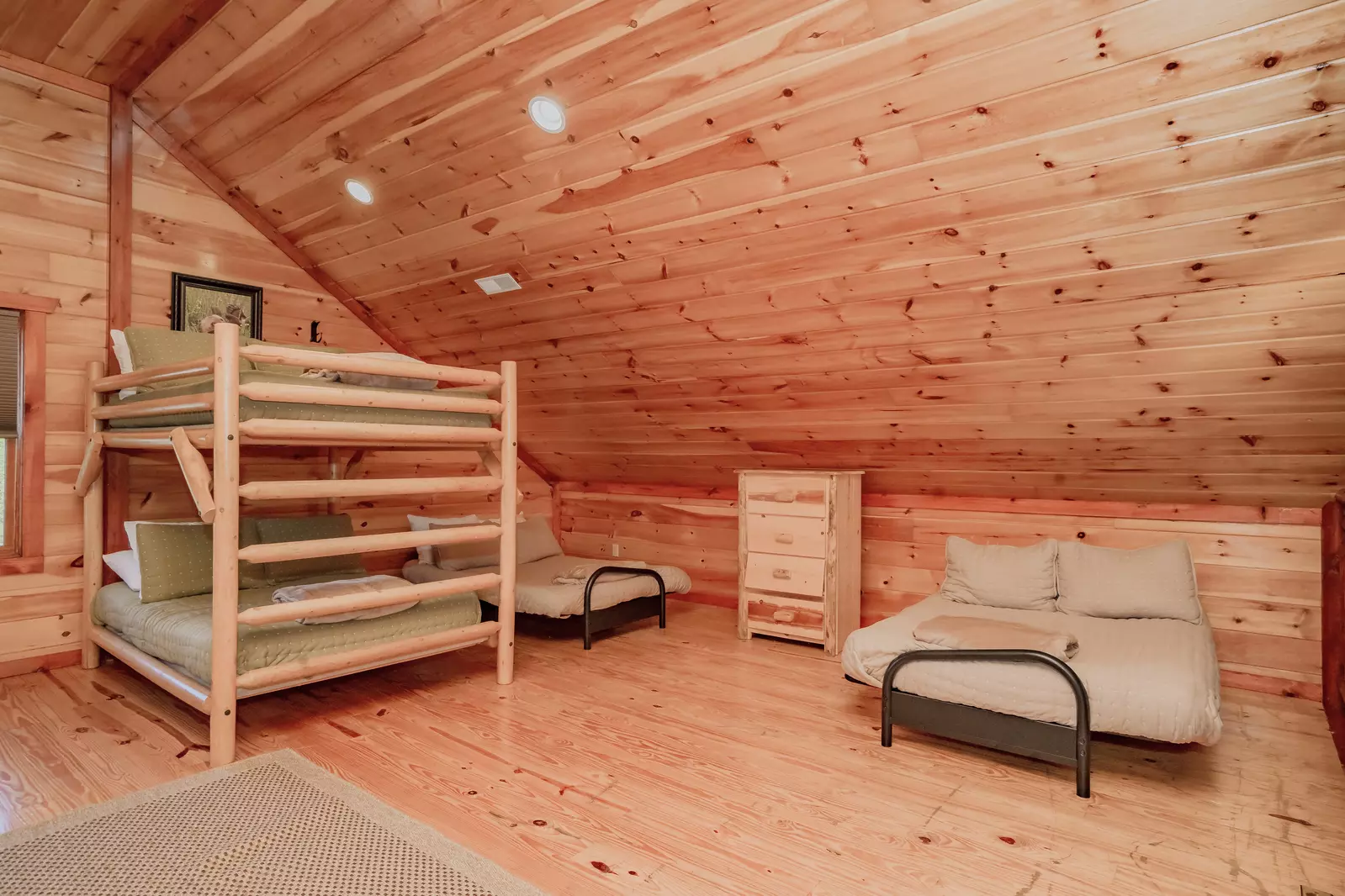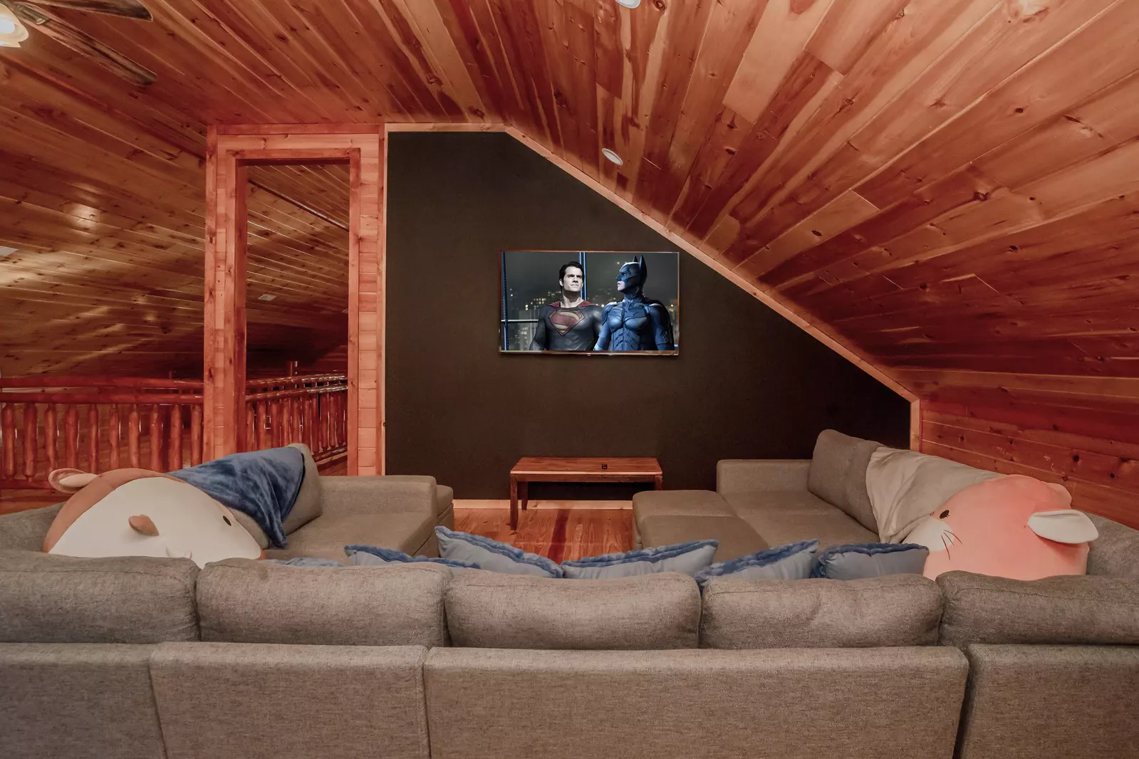 Rounding out this incredible cabin is the top floor. This level features 2 areas divided by a catwalk. On the one side you will find the theater/movie room and a bunk area, perfect for the kids. The theater area offers a comfortable sectional sofa with a built-in sleeper sofa and a large Smart HDTV Behind the theater seating, there is an additional game area featuring indoor axe-throwing and a nerf-gun wall . The bunk area (7th bedroom) offers a full-over-full bunk and 2 futons.