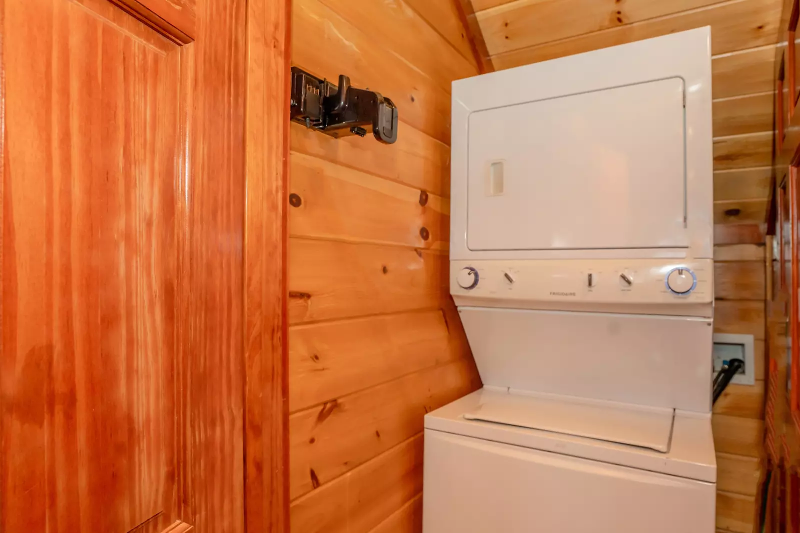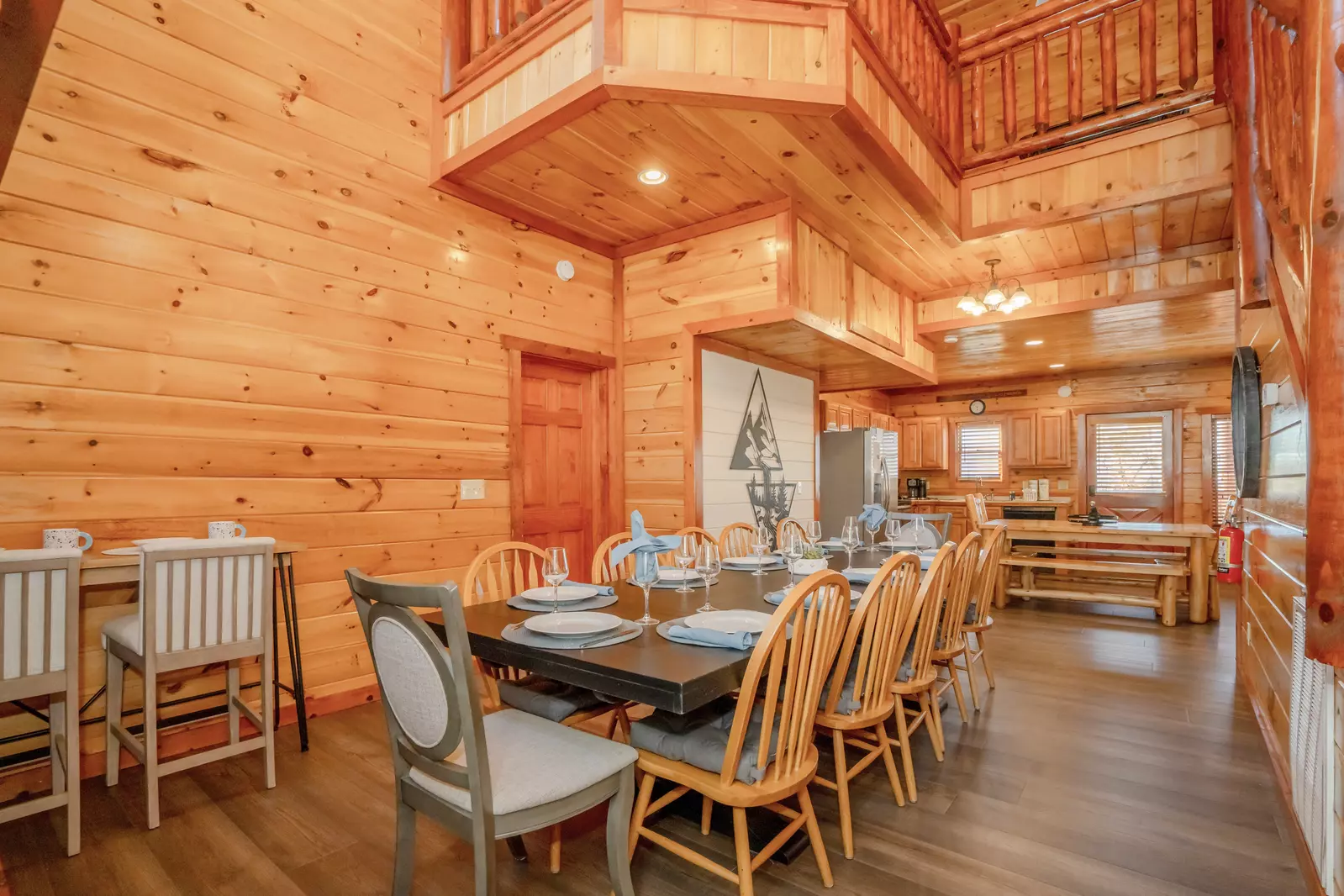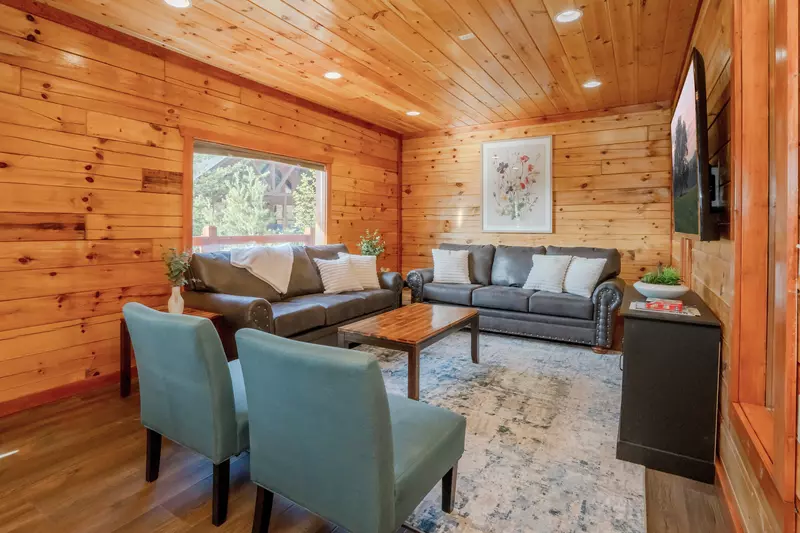 Rounding out this incredible cabin is the top floor. This level features 2 areas divided by a catwalk. On the one side you will find the theater/movie room and a bunk area, perfect for the kids. The theater area offers a comfortable sectional sofa with a built-in sleeper sofa and a large Smart HDTV Behind the theater seating, there is an additional game area featuring indoor axe-throwing and a nerf-gun wall . The bunk area (7th bedroom) offers a full-over-full bunk and 2 futons.