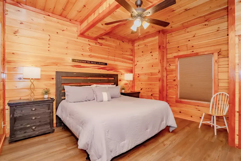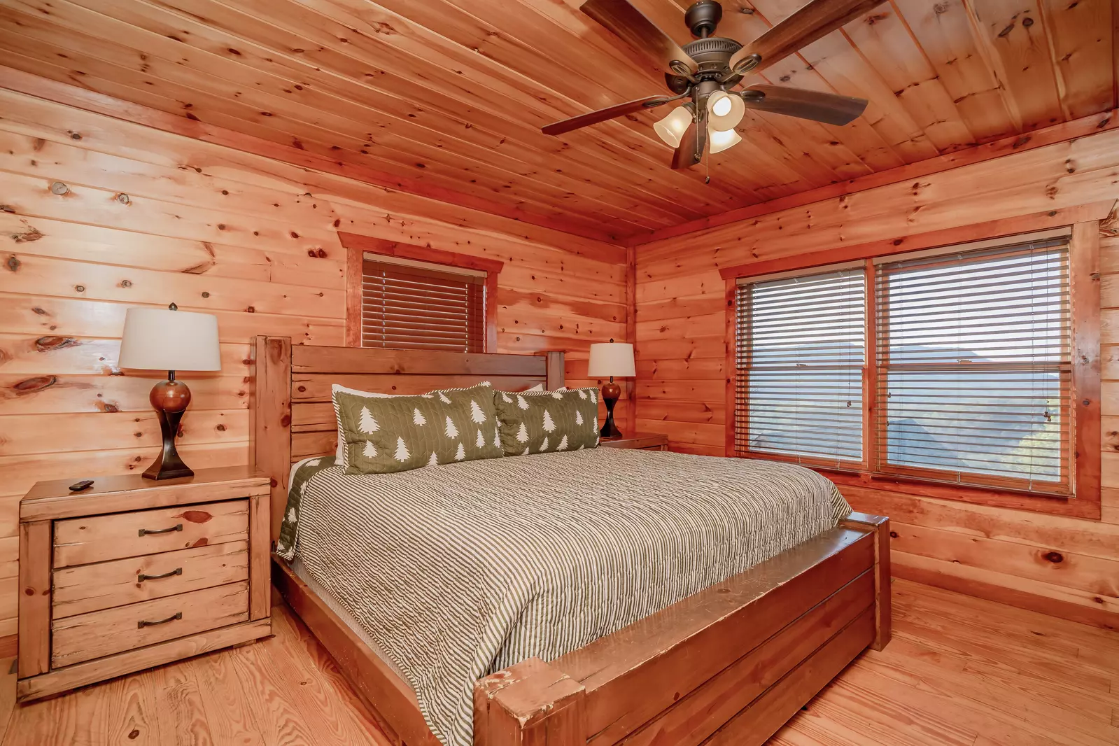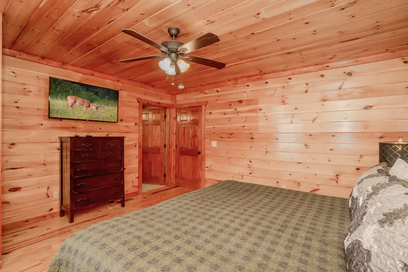The 4th bedroom on this level offers a king bed, Smart HDTV, and an en-suite full bathroom with tub/shower and views of the mountains.