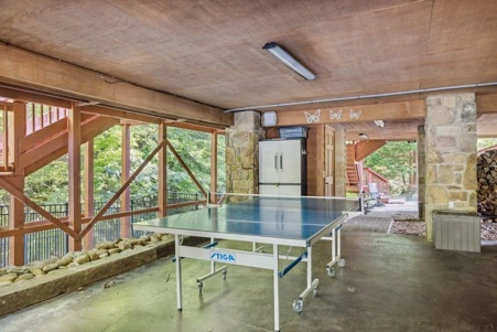 The lower level features a large game room with bumper pool table, shuffle board, arcade games and a games table (for chess or checkers).