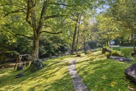 The deck offers comfortable seating, an outdoor dining table and a gas grill for a cook-out while enjoying the views of the mountains, golf course and rambling creeks below. Step out into the yard, gather around the fire pit by the creek, enjoy over 700 feet of Webb Creek frontage or explore the paths to the gazebo, the hot tub and swing.