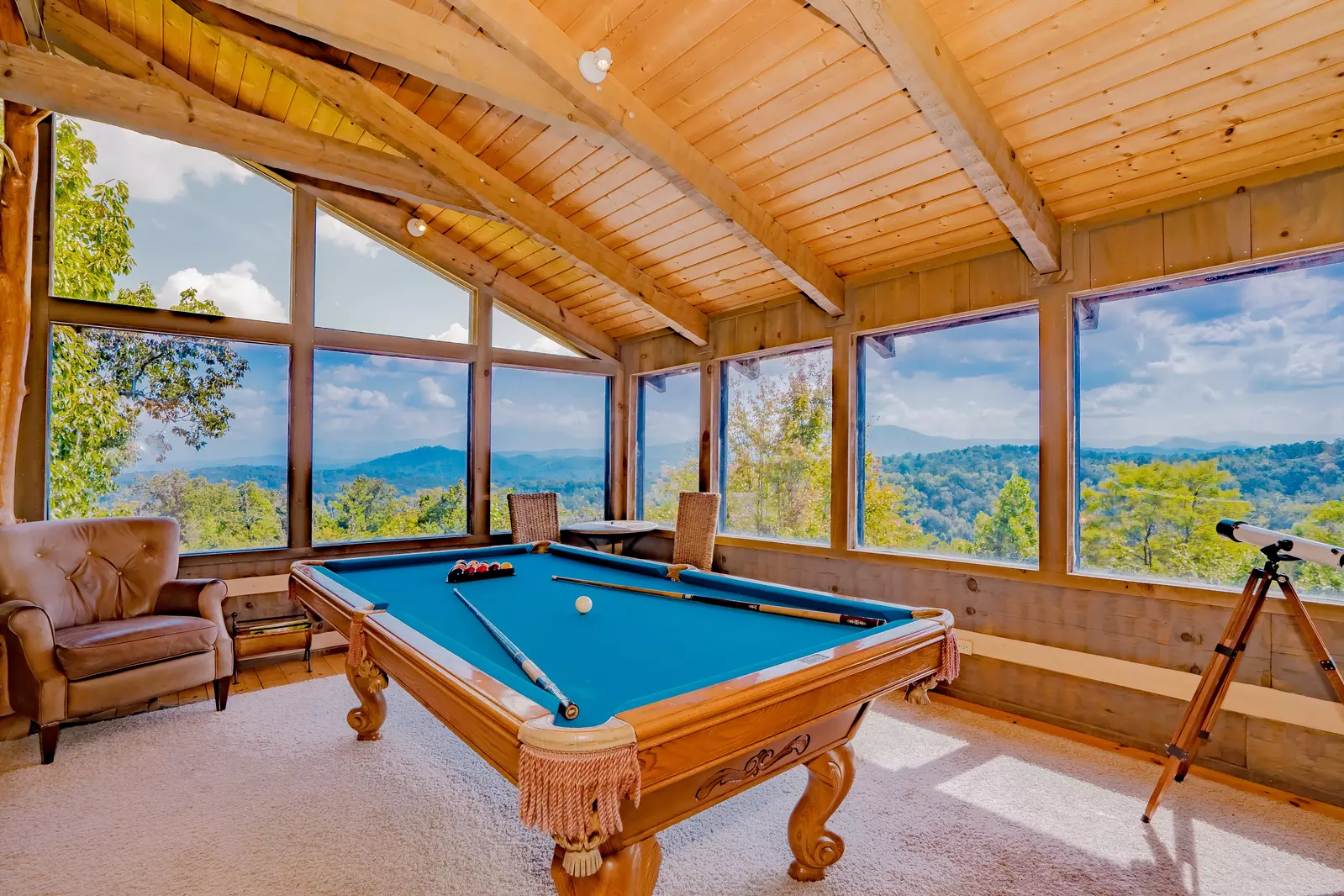 Welcome to Beau Voir! Meaning Beautiful Views in French, "Beauvoir" will give you exactly what it promises! Be warmly welcomed by the rustic charm and large picture windows awaiting you. Step out on to the covered porches to experience the breathtaking views afforded you from the comfort of the wooden rocking chairs while enjoying your favorite beverage of choice at the built in bar. Let the long day of exploration melt away with a soak in the private hot tub as you overlook the serene rolling mountain side. 1600 sqft gives you two bedrooms, a pool table, and views that will leave you speechless. This cabin is perfect for you and your loved ones.