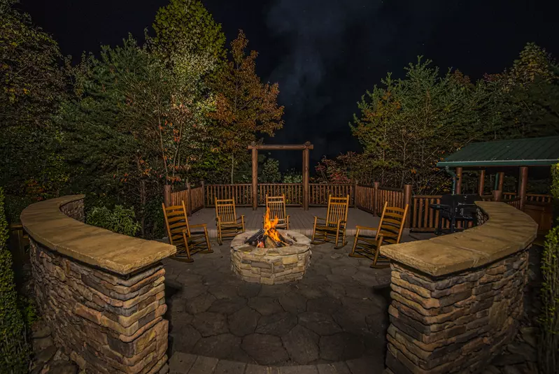 Welcome to Linger Lodge! This 3800+ sqft cabin is a well appointed, elegantly furnished log cabin with spectacular views! You will want to linger longer at this gorgeous, two story, four bedroom, Gatlinburg Cabin. The outside living space is the perfect place for an outdoor wedding or your family get together. A picnic table, charcoal grill and rocking chairs sit around the fire pit where you can build a fire and enjoy the breathtaking Smoky Mountain Views, all year round. An arbor that sits on the edge and looks out over the mountains is the perfect place for weddings and taking pictures. A covered hot tub sits to the right of this outdoor living space.