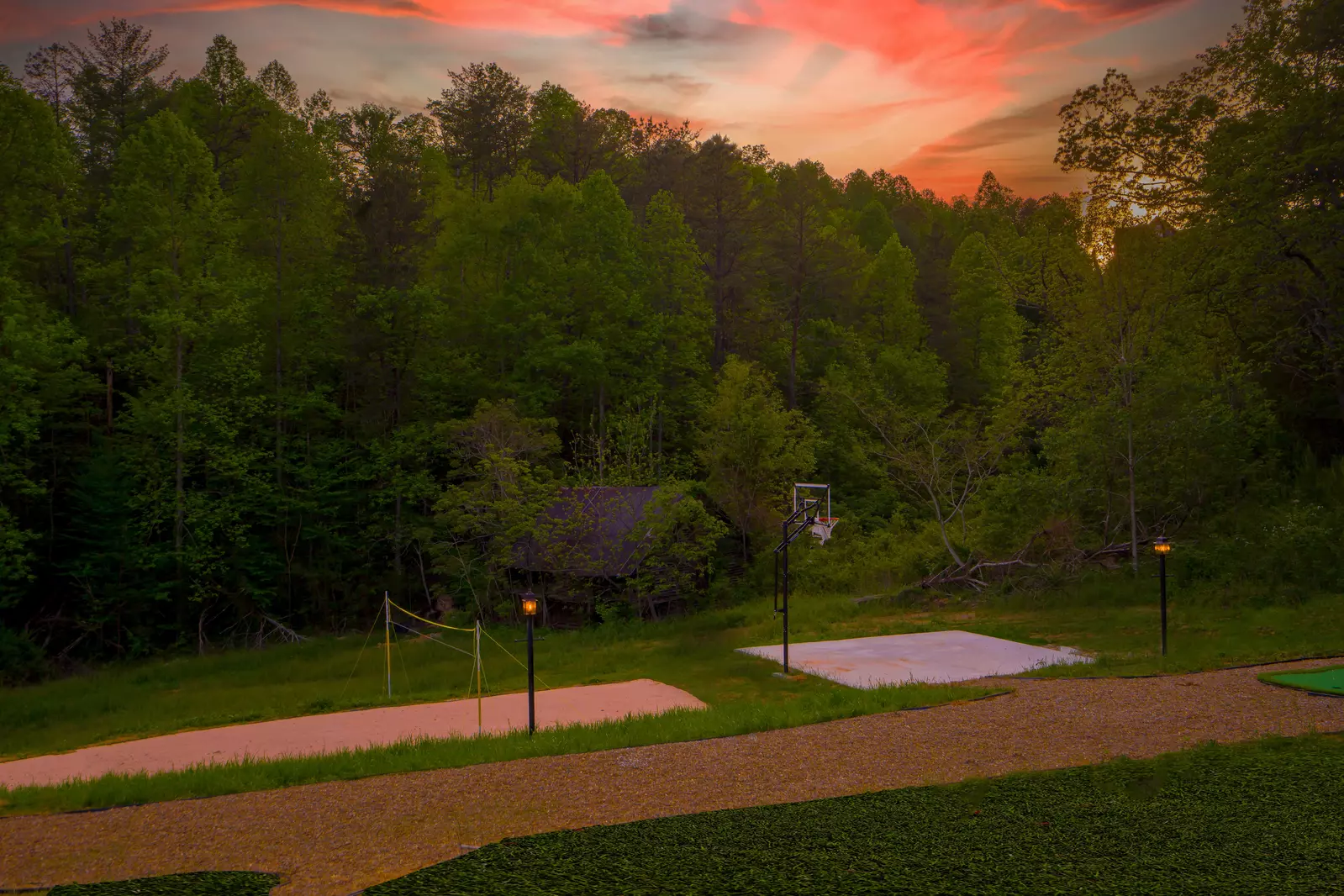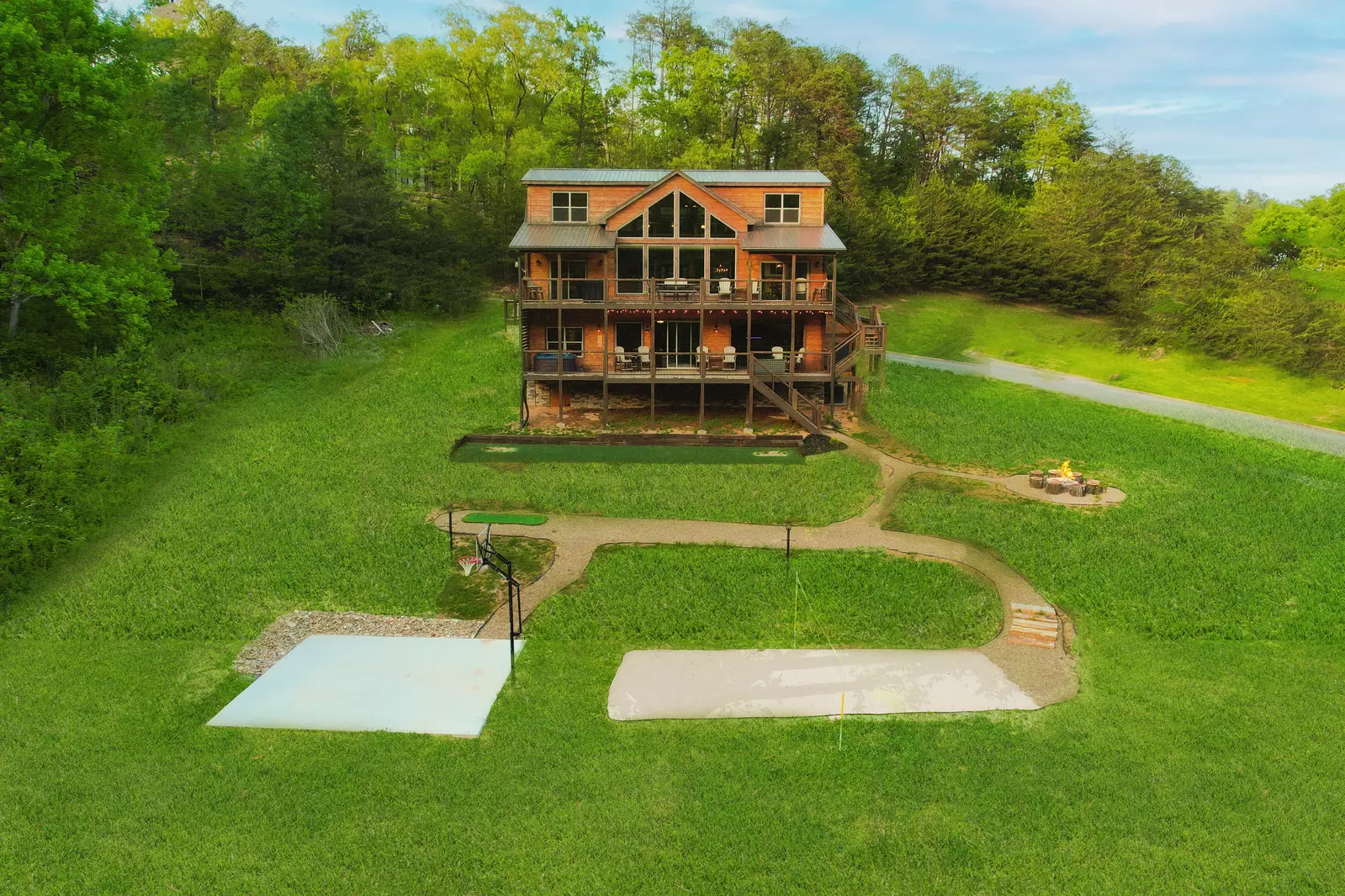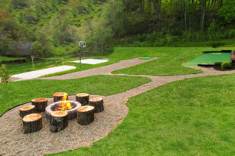 The large yard features a cozy fire pit and an Outdoor Family "Fun Zone", including a putting green, basketball half court, volleyball court, horseshoe pit and corn hole pit.
