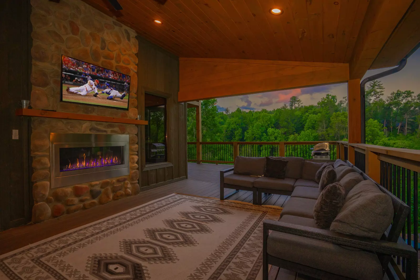 The living room features a stunning wall of windows, magnificent gas fireplace, comfortable high-end seating, large HDTV and access to the deck and covered porch.