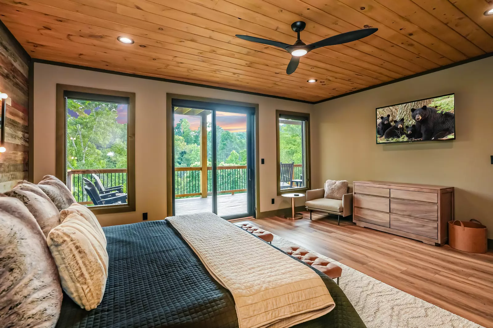 The 2nd bedroom features a king bed, large HDTV, a private full bath with tiled walk-in shower and access to a private covered porch with seating and a mountain view.