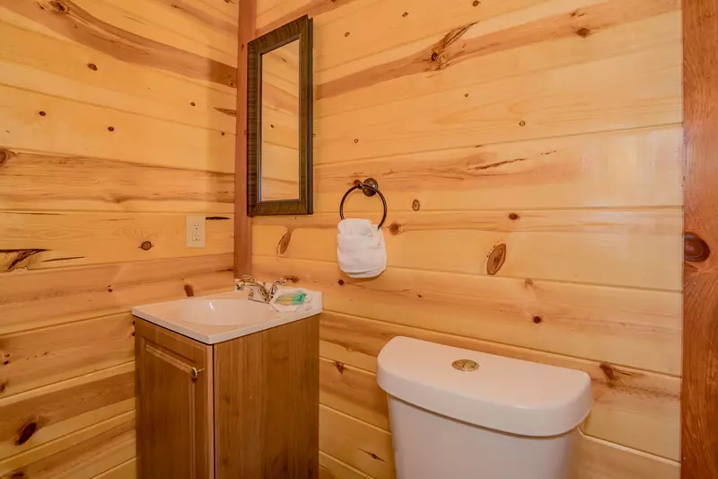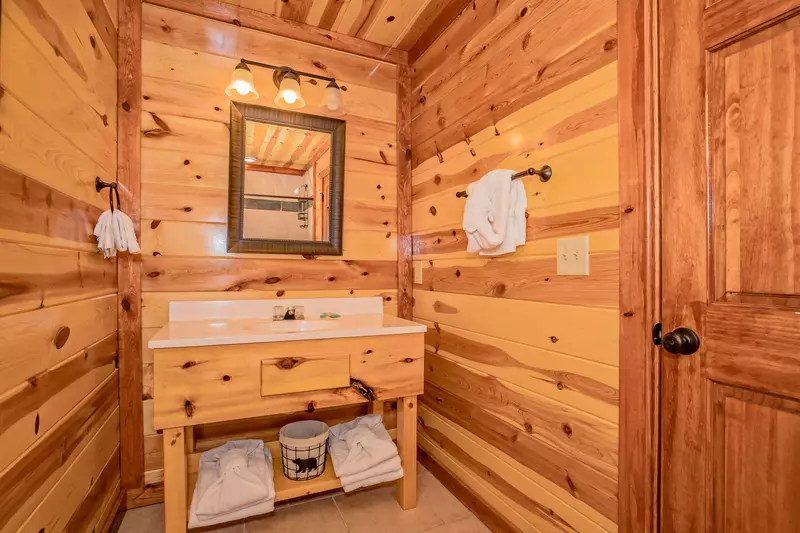 The entertainment area of this cabin features a pool table, a large TV and arcade games. The half bath is also conveniently located.