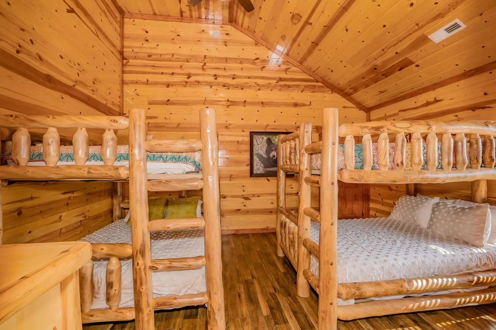 The upper level of this cabin features 4 bedrooms, 4 bathrooms and a deck with seating.