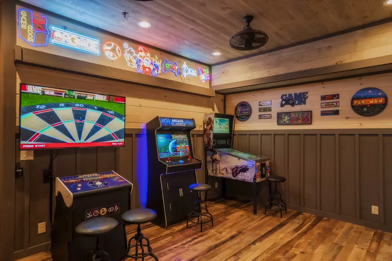 The game room offers multiple arcade games, including video pinball, lawn games and a multi-cade system.