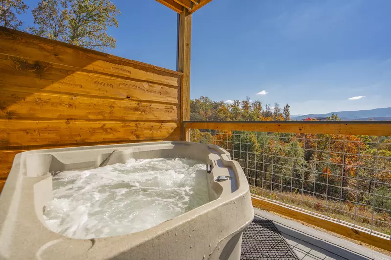 The second master suite has access to a private deck with a 2-person hot tub and beautiful views of the Smoky Mountains.