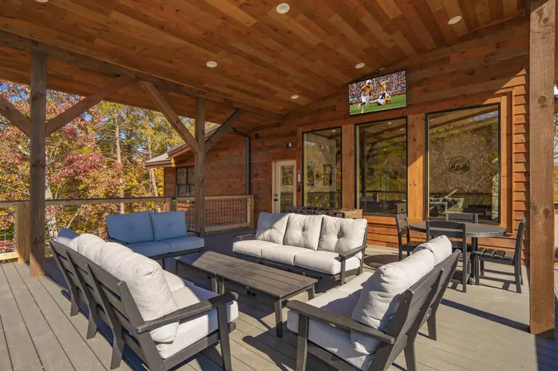 The covered deck on the main level features 2 outdoor tables with seating for 12 and a large outdoor HDTV. There is also additional seating on the wraparound deck space where guests can relax and enjoy the magnificent views.