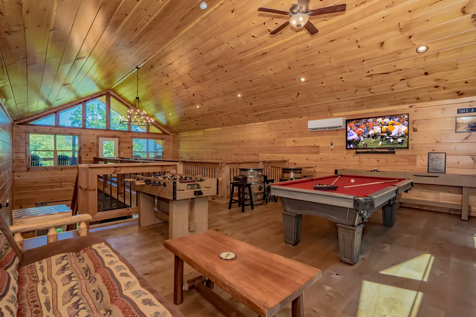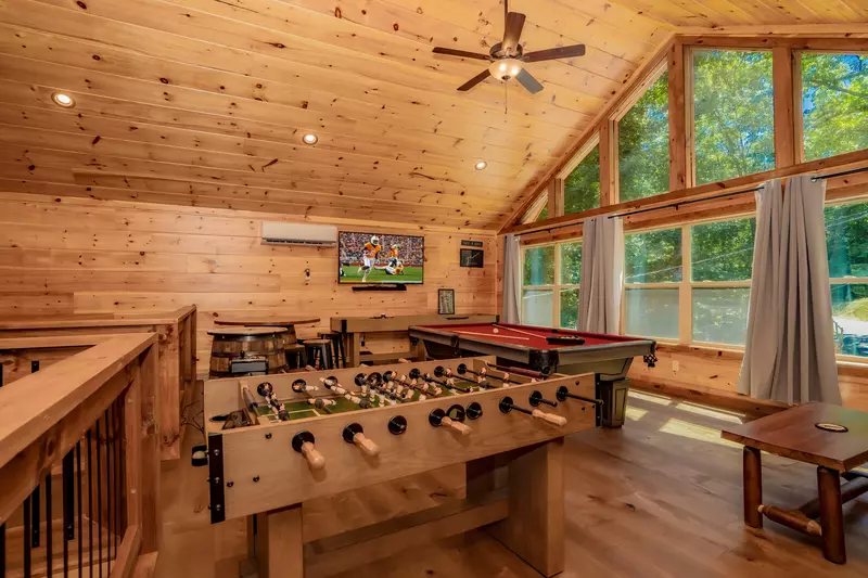 The spacious game room includes a pool table, foosball, arcade game, shuffleboard, HDTV, pub table, futon couch, and access to the covered deck.