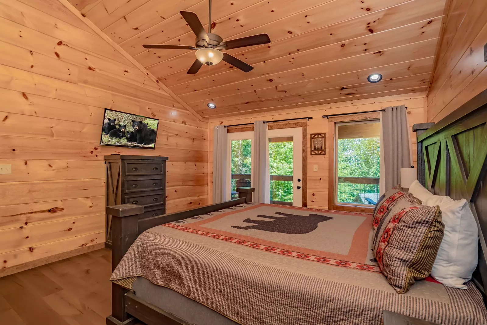 The four bedrooms on this level each feature king beds—except one which offers a queen bunk bed and sleeper sofa. Every bedroom has an HDTV, a full bathroom with tub/shower, and direct access to either the deck or covered deck.